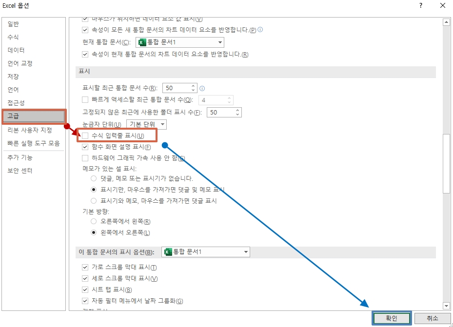 3. 고급 - 수식 입력 줄 표시 선택 후 확인 버튼을 누른다.