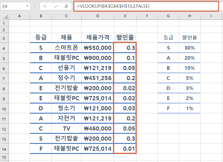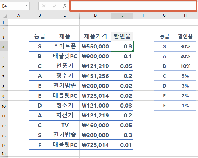 아래와 같이 할인율 영역의 수식 줄이 VLOOKUP함수를 사용했다고 표시가 되는데요. 이 수식을 안 보이도록 수식 없애기를 하겠습니다.