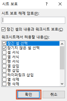 시트 보호 탭이 보이게 되는데 여기서 확인 버튼을 클릭해주면 끝이 납니다. 단, 시트보호 시 허용할 내용을 설정해줄 수 있는 데 이건 상황에 따라 체크해주면 됩니다.
