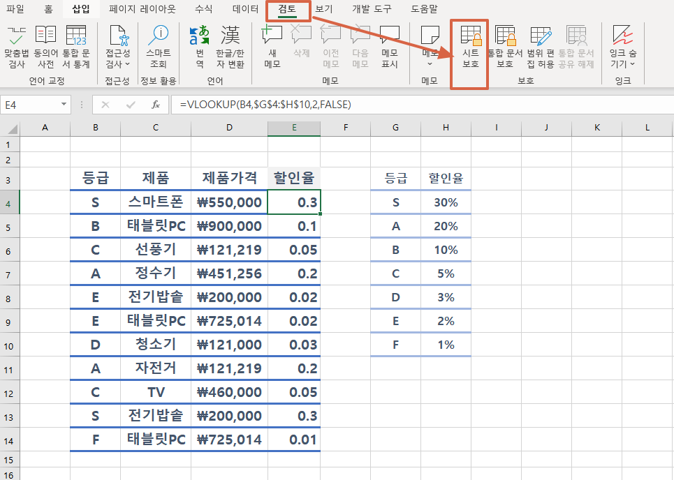 시트보호 후 할인율을 클릭하면 수식이 보이지 않는 것을 확인할 수 있습니다. 따라서 이렇게 하는 것이 엑셀의 수식 없애기를 하는 간단한 방법입니다.