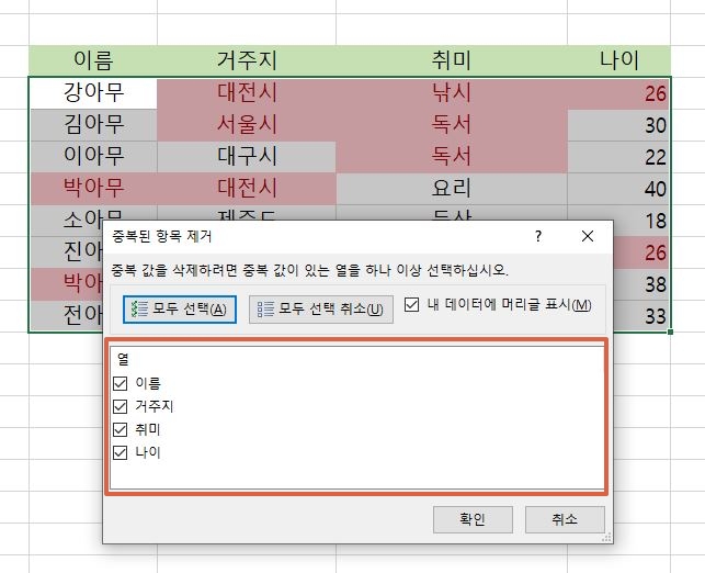 저는 '나이' 항목을 선택했습니다. 현재 '나이'의 중복된 값은 26살로 두 명이 존재합니다.