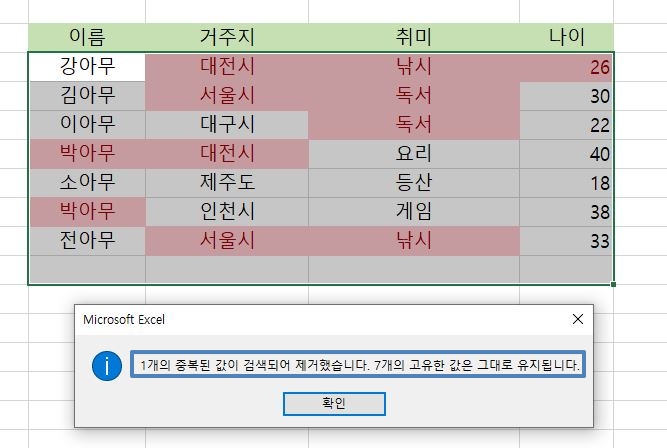 그리고 '나이' 항목에 대한 고유한 값만 남게 되는 것을 확인할 수 있습니다. 아래의 알림 창을 확인하세요.