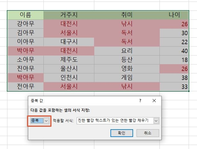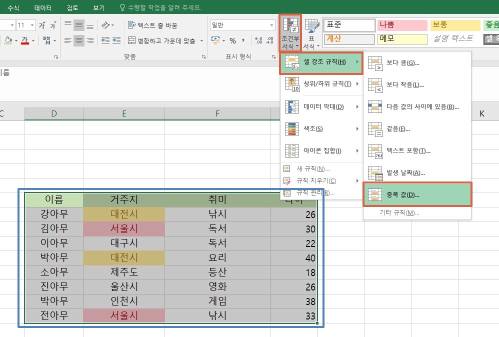 여기서 주의해야 할 점은 조건부서식을 사용할 때 데이터 영역을 선택 후 눌러야 한다는 점입니다. 중복 값을 찾고자 하는 이름, 거주지, 취미, 나이 영역을 드래그를 통해 지정합니다.