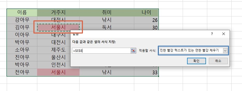 그 후 팝업에서 셀의 값을 선택할 수 있습니다. 여기서 중복 값을 찾기 원하는 데이터 위치를 클릭합니다. 그리고 옆의 적용할 서식을 선택해주면 됩니다. 적용할 서식에서는 색을 선택할 수가 있습니다. 그러면 아래 사진과 같이 '서울시'와 중복된 값을 가진 영역에 빨간색으로 색이 변경되는 것을 확인할 수 있습니다.
