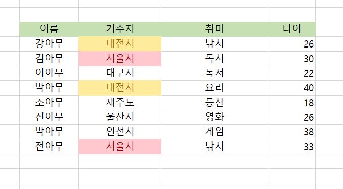 위의 사진은 '대전시'와 '서울시'의 중복 값을 찾아 색을 다르게 표시해 봤습니다. 첫번째 방법보다는 두번째 방법이 한눈에 보기 편하고 좀 더 쉽게 할 수 있습니다. 저는 앞으로 두번째 방법으로 엑셀 중복값을 찾아야겠어요.