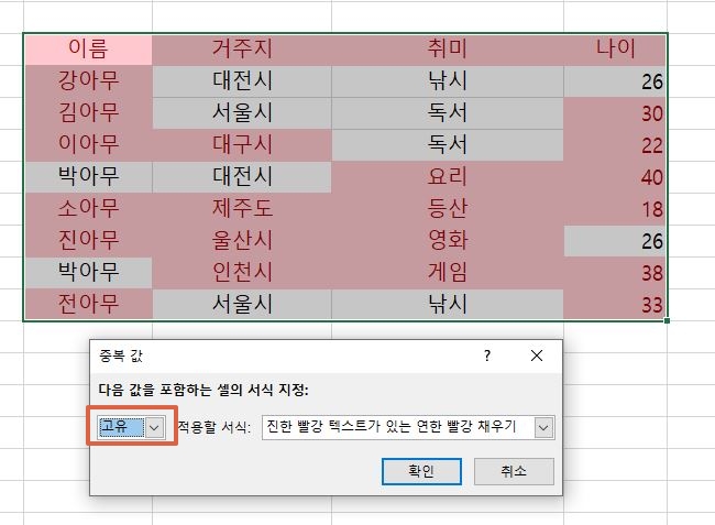 그러면 모든 중복 값의 색이 변함을 확인 할 수 있습니다. 여기서 '고유'를 선택하면 중복되지 않은 모든 값이 표시됩니다. 중복도 필요하지만 고유값도 알면 좋을 것 같네요.