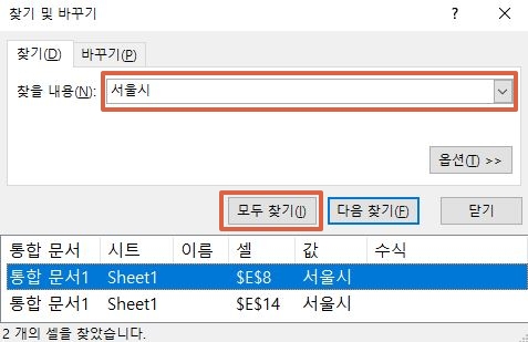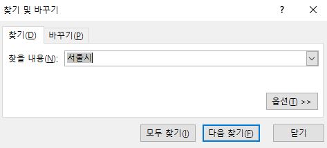단축키를 누르면 찾기 및 바꾸기 팝업창이 오픈됩니다. 여기서 저는 '서울시'라는 값을 표시해보도록 했습니다. '서울시'라는 값이 어디에 중복되어 있을까요? 한번 표시해 보도록 하겠습니다. 찾을 내용에 '서울시' 라고 입력하고 모두 찾기 버튼을 클릭합니다.