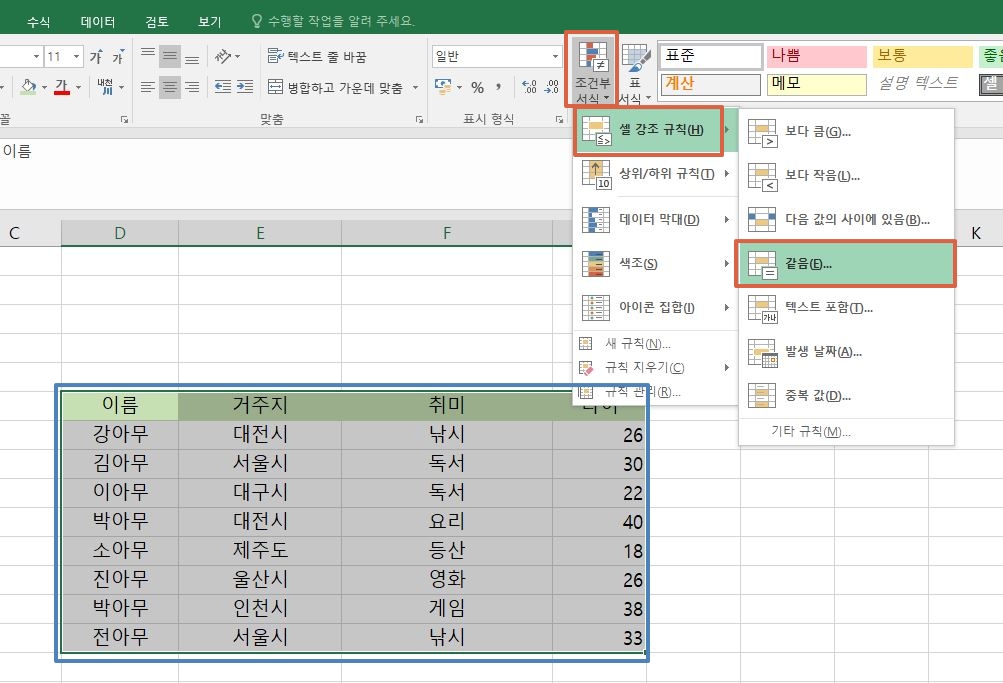 그 후 조건부 서식의 셀 강조 규칙을 클릭하고 오른쪽 메뉴의 같음을 클릭합니다.
